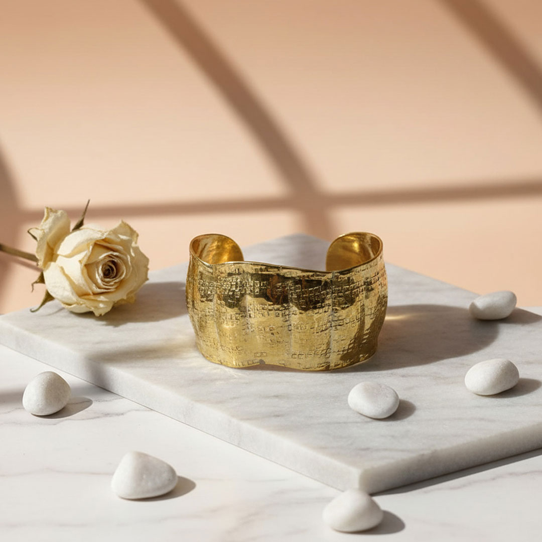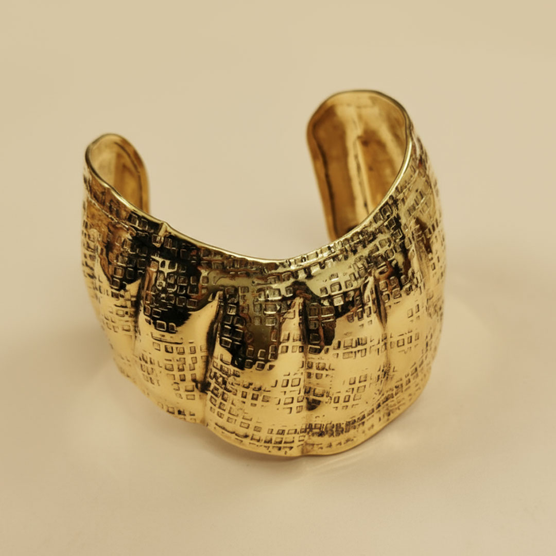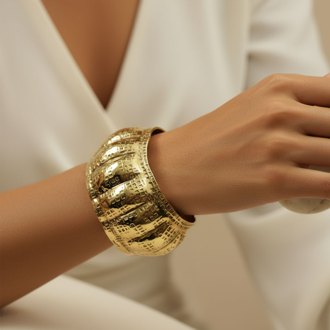 Make a bold style statement with this Metallic Gold Textured Hammered Wide Dessert Dune Cuff. Crafted from high-quality metal, it features a hammered, grid-like embossed pattern with an irregular wavy design that adds contemporary charm. The metallic gold finish enhances its striking appeal, making it a versatile accessory for casual wear, festive occasions, or as a standout statement piece.