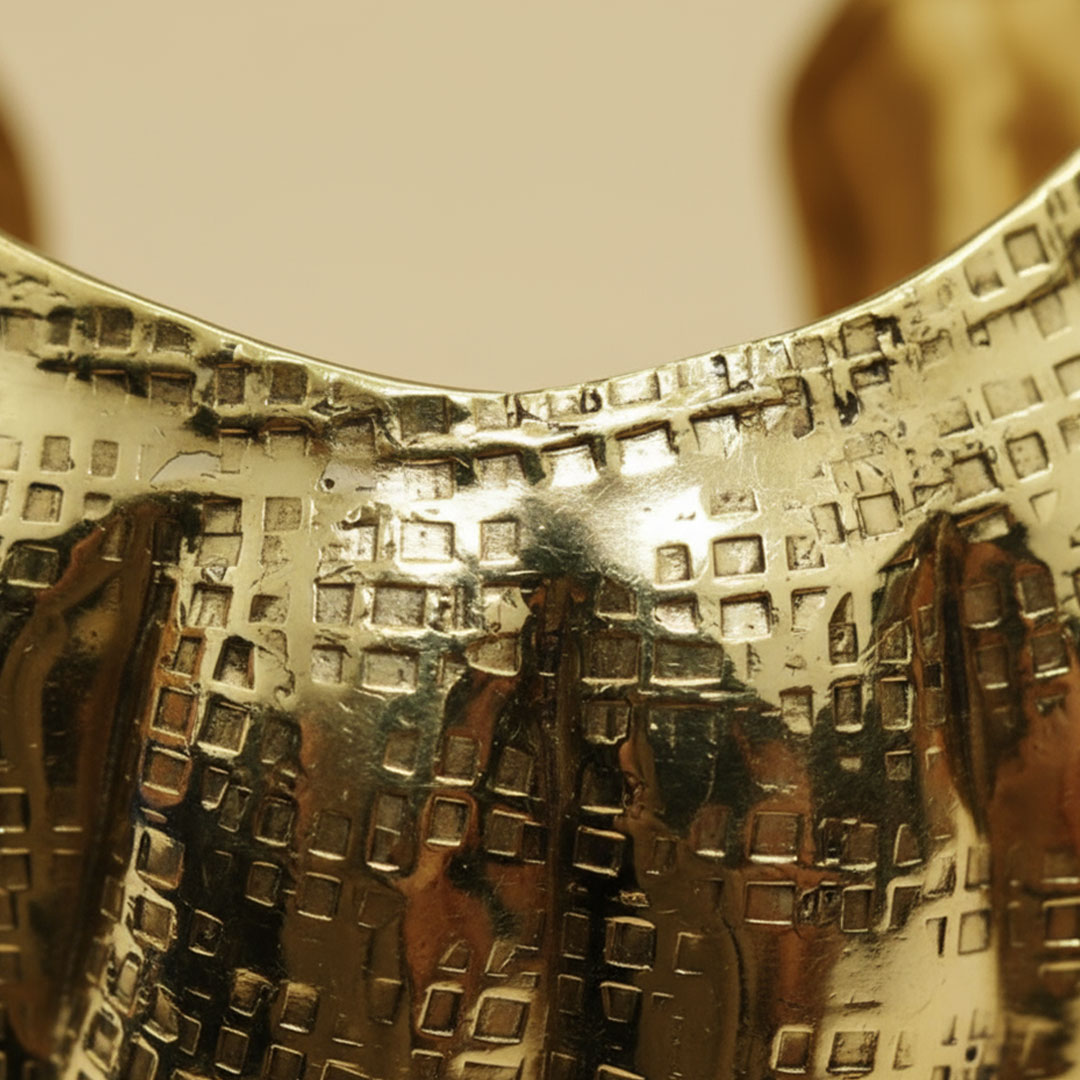 • Design: Wide cuff with hammered, grid-like embossed pattern